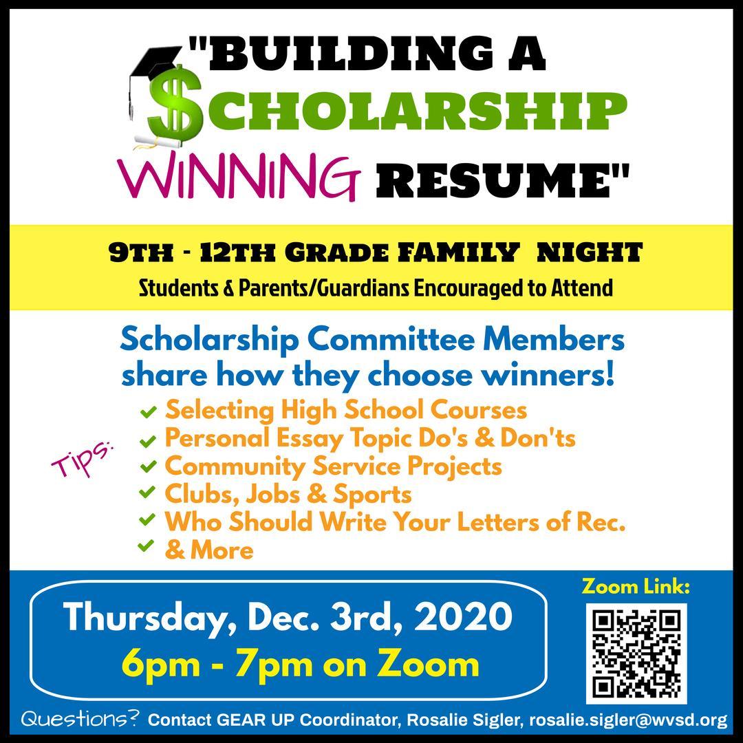 Scholarship Writing Event For Students And Families Hear from a panel of scholarship committee members who will share how they choose winners. Please register here to receive the Zoom link. Published November 30, 2020 Print